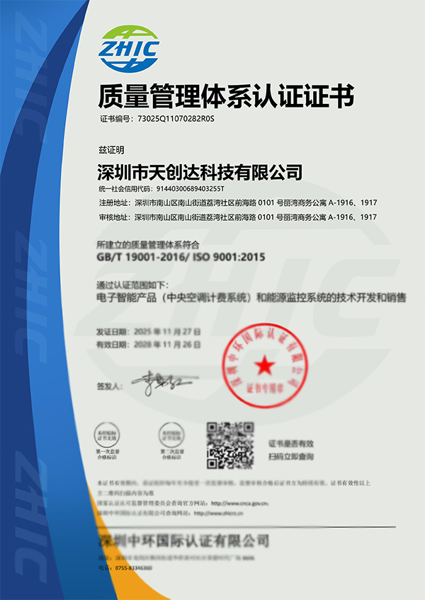 公司尊崇“產(chǎn)品質(zhì)量是第一生產(chǎn)力”,通過了質(zhì)量管理ISO9001:2015體系認(rèn)證、環(huán)境管理IS014001:2015體系認(rèn)證及職業(yè)健康安全管理IS045001:2018體系認(rèn)證,截止2025年底,天創(chuàng)達(dá)的產(chǎn)品與解決方案已服務(wù)全球?qū)⒔?000多個(gè)標(biāo)志性建筑、終端用戶突破300多萬(wàn)戶、應(yīng)用于2.5億多平方米的建筑面積、累計(jì)節(jié)能量達(dá)到3億多度電、相當(dāng)于減少C02排放近30多萬(wàn)噸,包括:北京人民大會(huì)堂、深圳國(guó)際新會(huì)展中心、深圳桃源街道紅花嶺工業(yè)南區(qū)更新單元、深圳市鵬城實(shí)驗(yàn)室石壁龍園區(qū)一期、深圳灣科技生態(tài)園、深圳創(chuàng)智云城、深國(guó)際華南物流中心、深圳瑧灣匯、珠海中心大廈、珠海市橫琴國(guó)際青年文化中心、上海中天大廈、中國(guó)科學(xué)院大學(xué)重慶學(xué)院一期、浙江杭州國(guó)際博覽中心、江蘇亞泰財(cái)富中心、湖南省人民檢察院、湖北武漢光谷里、四川高盛金融中心、安徽合肥金融港、江西南昌大學(xué)第一附屬醫(yī)院象湖新院、貴陽(yáng)壹號(hào)、河南鄭東新區(qū)龍湖金融中心區(qū)域供冷供熱項(xiàng)目、福州東南大數(shù)據(jù)產(chǎn)業(yè)基地、廣西南寧威壯大廈、山東青島國(guó)際院士港、海南瓊劇院等公共建筑、大型園區(qū)、綜合體、辦公樓、寫字樓、區(qū)域供能、學(xué)校及醫(yī)院。產(chǎn)品獲得湖南省、江蘇省、河南省、上海市等多個(gè)省/市級(jí)住房和城鄉(xiāng)建設(shè)廳推廣應(yīng)用。